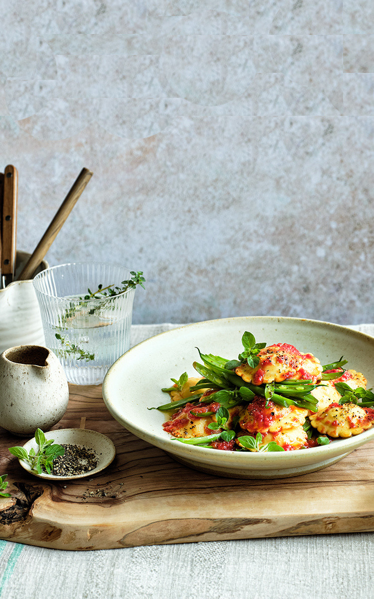 Rana Pesto Genovese –raviolit sokeriherneillä ja kotitekoisella tomaattikastikkeella