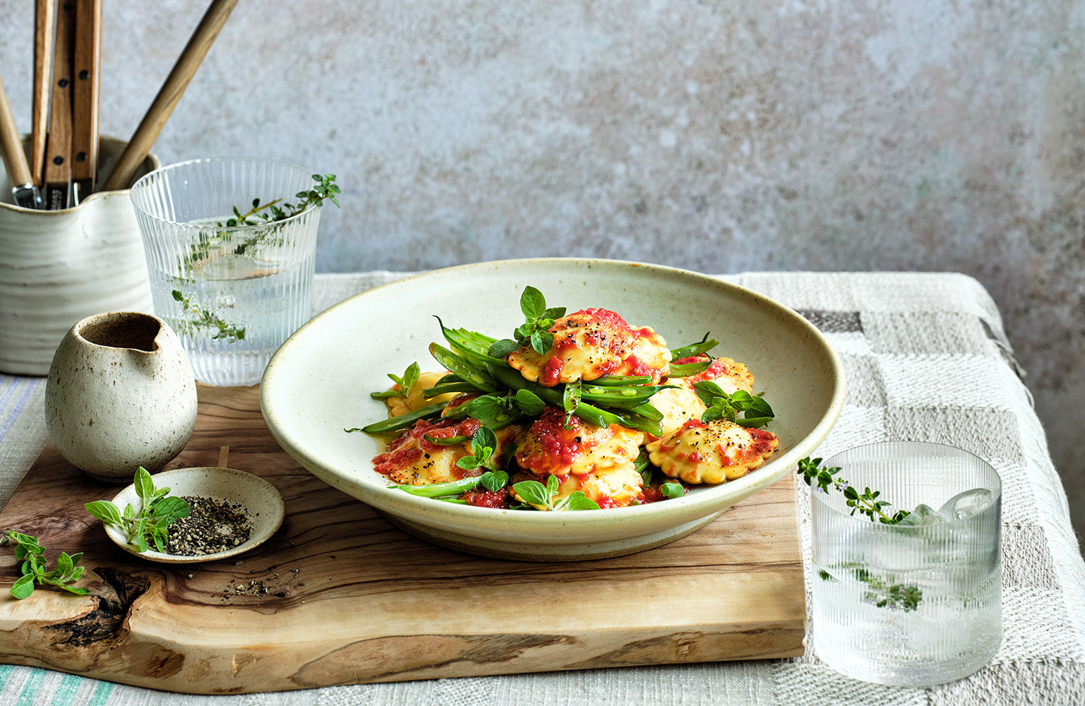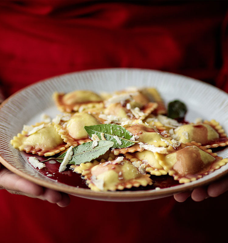 gorgonzola ravioli med rostade fikon, ruccola och brynt smör
