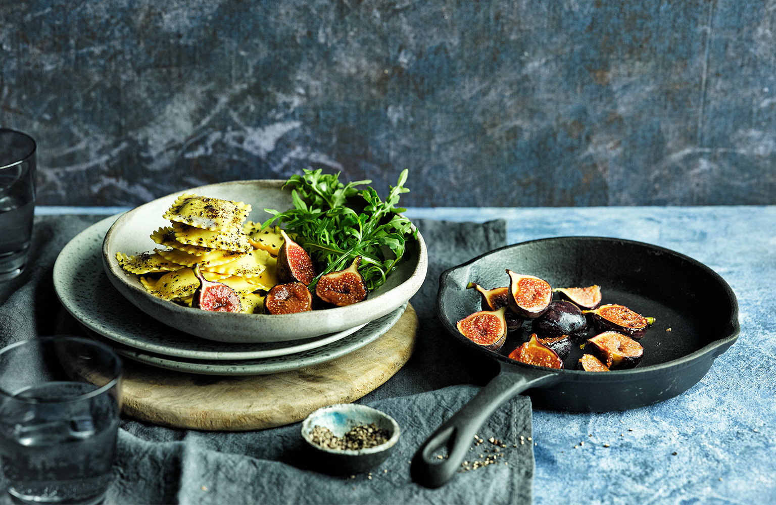 gorgonzola ravioli med rostade fikon, ruccola och brynt smör